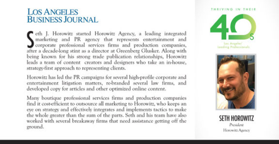 Seth Horowitz, President of Horowitz Agency, has been named to the Los Angeles Business Journal‘s prestigious list of “Most Influential Marketers.” The list highlights Los Angeles’ top marketing professionals for their contributions to the local business community’s success. The full issue can be found here....
