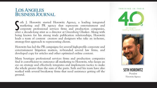 Horowitz Agency is pleased to share that its President, Seth Horowitz, was recently profiled in the Los Angeles Business Journal’s “Leaders of Influence: Thriving in Their 40s” issue for 2021. Each year, the list honors leading Los Angeles business professionals in their 40s who demonstrate success inside business and throughout their communities. Seth was recognized for his strong trade publication relationships; the agency’s in-house, strategy-first approach to representing clients; and his years of experience handling any and all PR and marketing projects on behalf of boutique professional services firms and production companies. Congratulations, Seth!